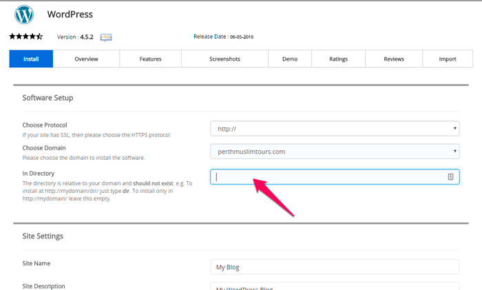 2. Scroll ke bahagian softaculous Apps Installer dan klik pada icon Wordpress. Paparan untuk install wordpress akan muncul.