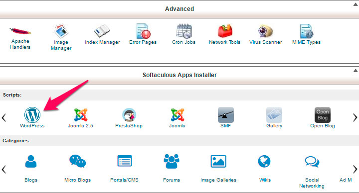 4. Scroll halaman ini kebawah sehingga anda berjumpa dengan modul ‘softaculous Apps Installer‘ dan klik pada lambang Wordpress.