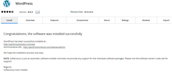 14. Installation memakan masa sekitar 1~2 minit sahaja. Setelah selesai, akan keluar paparan yang menunjukkan link untuk login ke akaun blog wordpress baru anda.