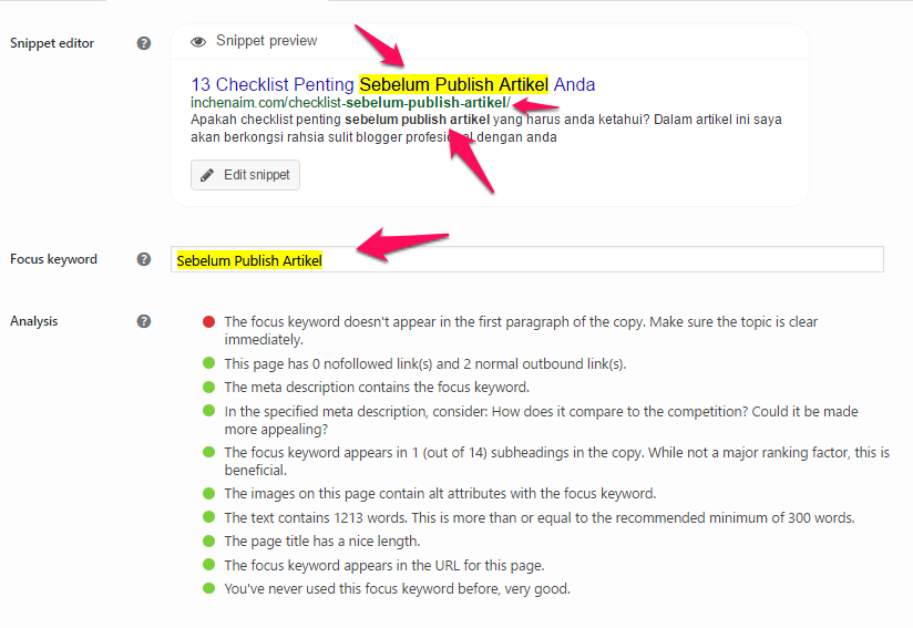 Sebagai contoh: focus keyword untuk artikel ini adalah ‘Sebelum Publish Artikel’
