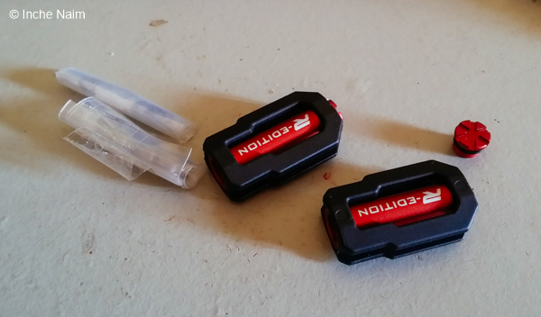 Sepasang knob M5 diletakkan dengan rapi di dalam kotak yang dilapisi span. Setiap set kotak ini juga disertakan dengan sepaket washer dan juga bushing.