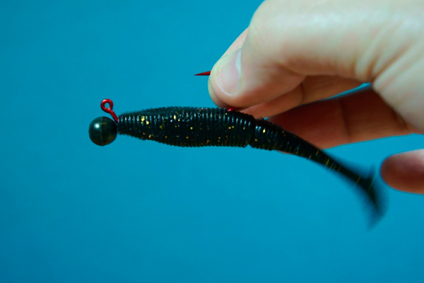 - Pastikan penembusan hujung mata kail di tengah-tengah badan gewang soft plastic. Jika hujung mata kail tembus ke sisi atau senget, SP tidak akan berenang dengan betul.