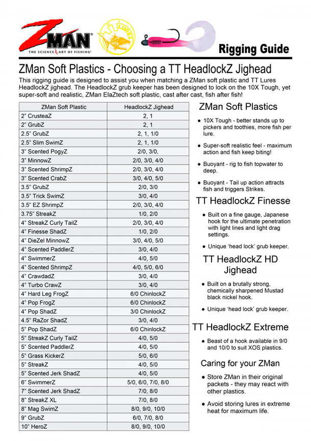 Dibawah ini adalah rujukan saiz mata kail sesuai untuk soft plastic mengikut saiz (inci) yang dikeluarkan oleh TT Lures: